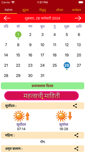Marathi Kalender 2025 är en användarvänlig app som hjälper användare att hålla koll på viktiga datum, traditioner och festivaler kopplade till Marathi-kulturen. Med en detaljerad översikt över både Marathi och gregorianska kalendrar, erbjuder appen en komplett månad-för-månad vy för hela året. Den inkluderar även dagliga Panchang-detaljer, vilket ger användarna information om tithi, nakshatra, yoga och viktiga tider för sol- och mångångar.